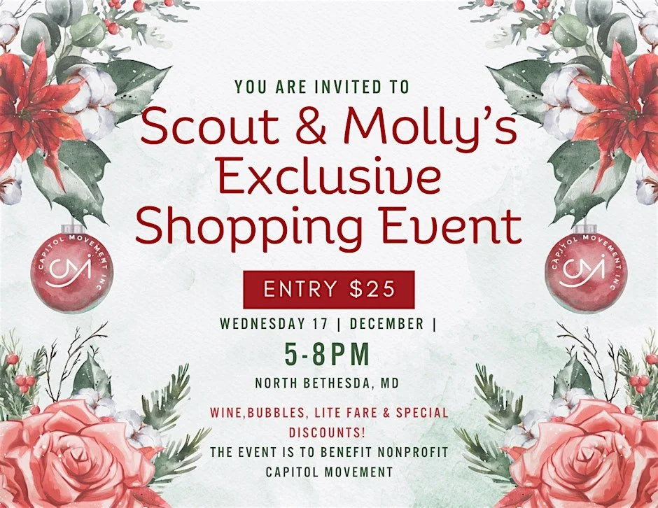 Get ready for some festive fun at Scout & Molly's! Join us in person for an awesome holiday shopping experience that gives back. A portion of the proceeds will benefit Capitol Movement, so you can shop guilt-free while supporting a great cause. Don’t miss out on exclusive deals, raffles & prizes, cozy vibes, and a chance to make your holidays even brighter!